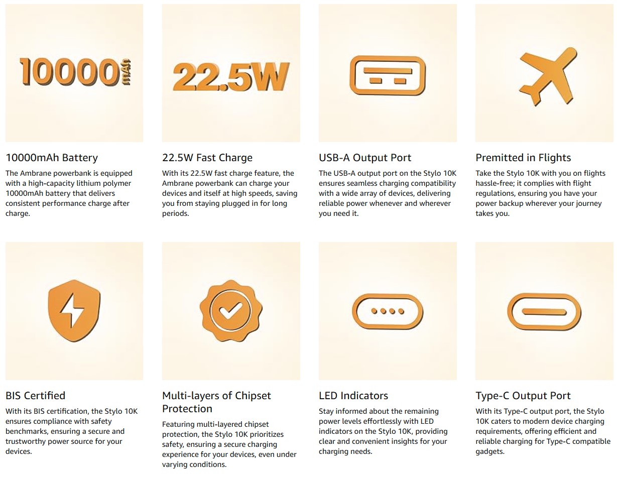 - High-capacity Battery - With a lithium polymer battery of 10000mAh capacity, this powerbank can charge your devices multiple times.