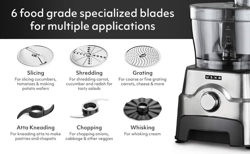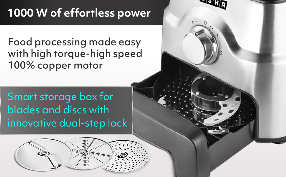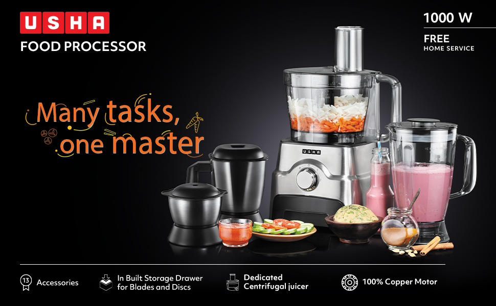 Usha FP 3811 Food Processor 1000 Watts Copper Motor with 13 Accessories(Premium SS Finish), Black and Steel