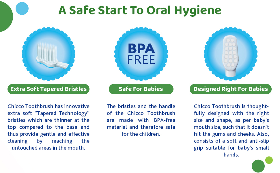 Chicco Baby Manual Toothbrush For Infants (6M-36M), Set Of 2|Extra Soft Tapered Bristles Ideal For Milk Teeth|Bpa Free (Blue, Green)