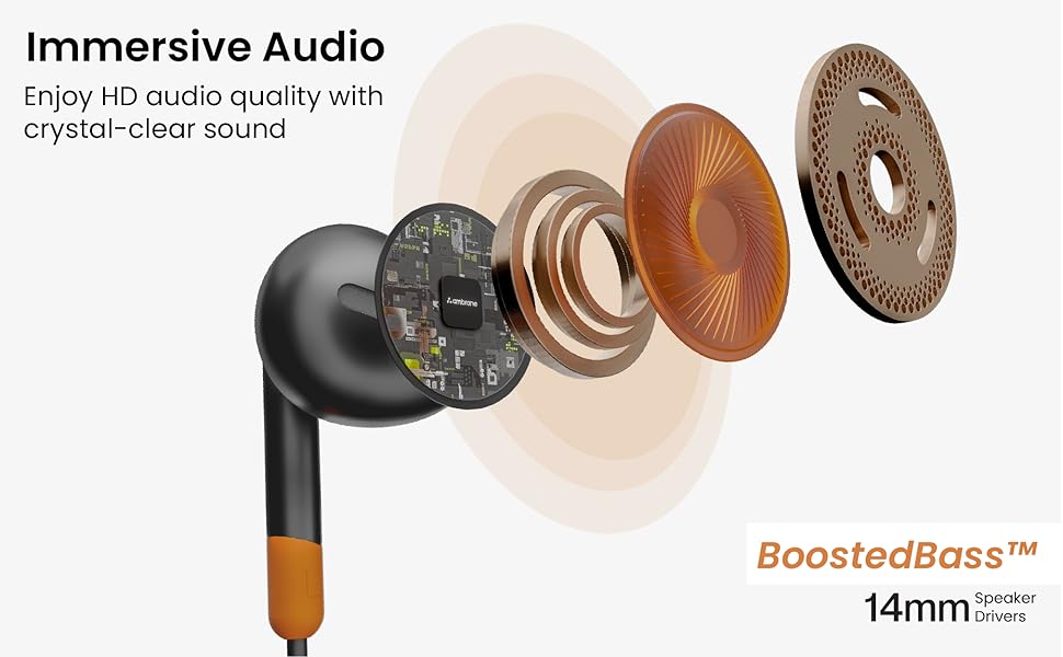 • Boosted Bass - The earphones come with high bass quality and 14mm dynamic drivers for a pure listening experience. Enjoy your favourite web series and songs with an HD-quality audio experience.;Comfy Fit Design - The earphones are crafted with a comfy in-ear fit design for extra comfort and more stability during long periods of listening.