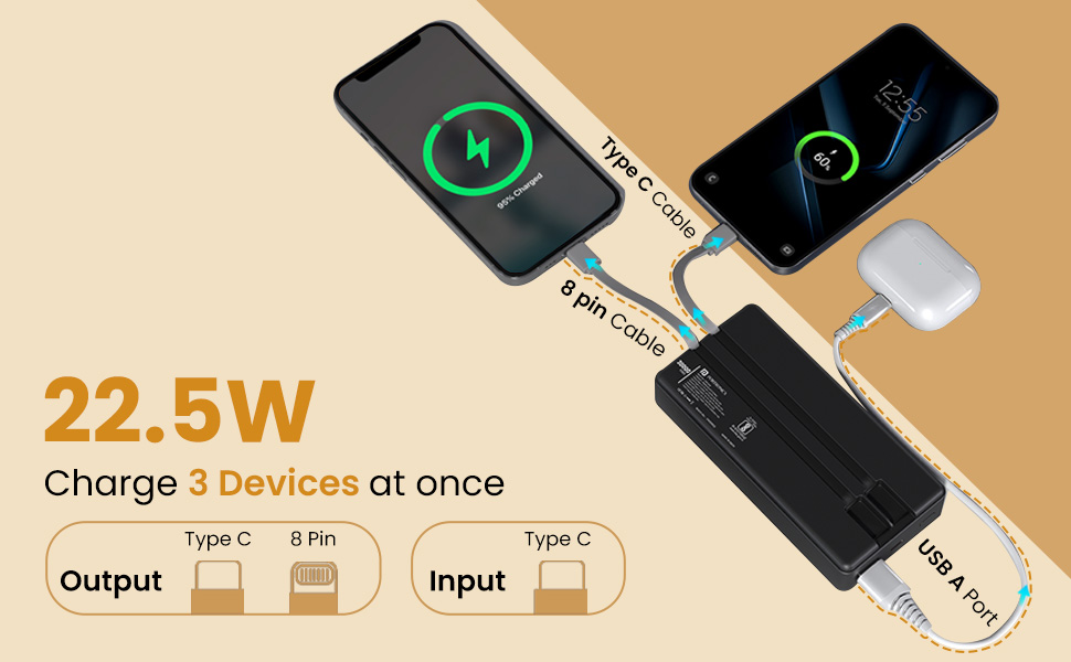 - Universal Device Compatibility: The 22.5W power bank features triple outputs: a USB-A port, a built-in Type-C cable, and a built-in 8-pin cable. Keep your smartphones, tablets, earbuds, and more powered up – no matter what brand you use.