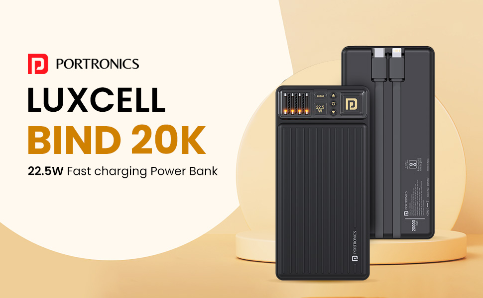 Portronics Luxcell Bind 20k 20000mAh Powerbank with 22.5W Fast Charging, in-Built Type C PD(Input & Output) /8 Pin Cable, LED Indicator, USB-A Mach Output, Compatible with Smartphones,Tablets(Black)