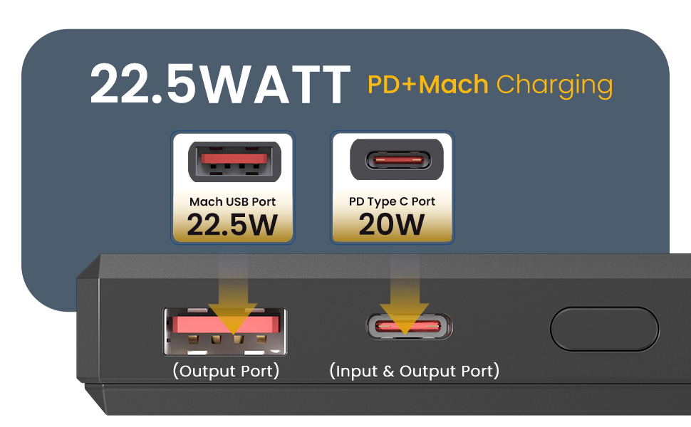 • Dual Port Fast Charge: This fast charging power bank offers you Fast charging via Type C PD Port and USB MACH port, so you can charge multiple devices at one time. Refuel the power bank via the Type C port.