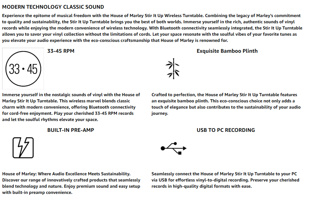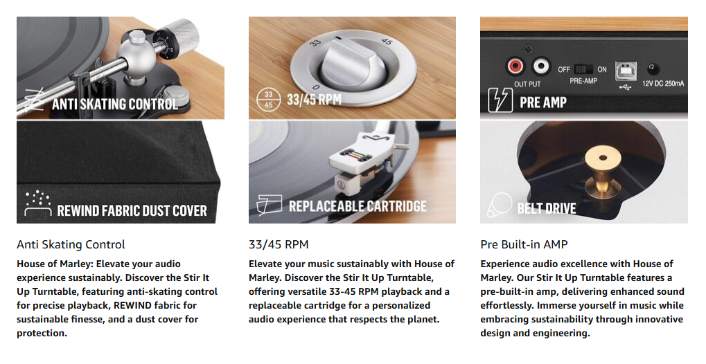 - SUPERIOR AUDIO: A new spin on an old classic, our Stir It Up Wireless Turntable offers a modular Audio Technica cartridge and built-in pre-amp and delivers premium audio quality and lets you enjoy your every sonic detail of your favorite vinyl records; If you prefer to use your own pre-amp, simply switch the internal amp off to connect one of your choice
