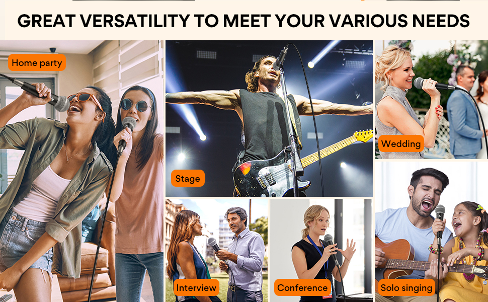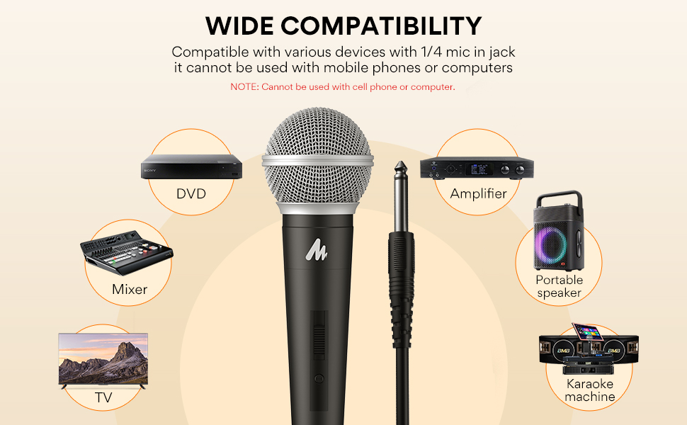 • XLR-to-1/4 cable supplied, you just need to connect audio cable with microphone and plug to various devices, such as DVD, television, KTV audio, reverberator, mixer, tour bus, etc. can be mounted on any standard