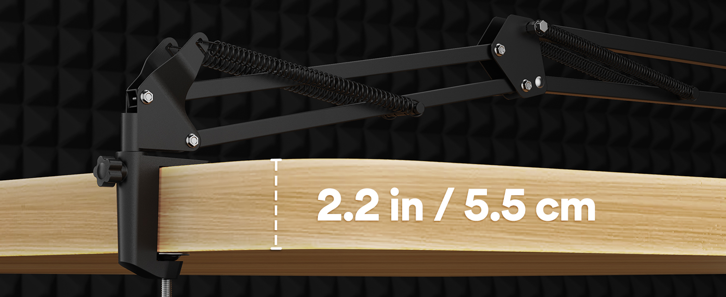- Universal mounting clamp attaches to tables, desks, shelves, counters, etc. Suitable for any stores, families, stages, studios, broadcasting and TV stations, etc. with an adjustable positioning screw, can easily clip to any desktop up to 1.7"/4.5cm thick