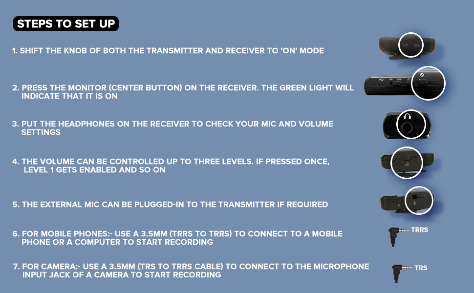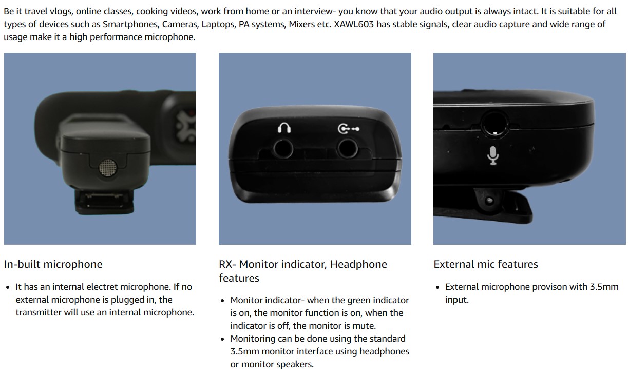 • Monitor Port for Audio monitoring, Playback Port for real-time music output, Volume indicator for volume level, power indicator for power status indication and sturdy back clip provided for microphone and receiver for smartphone and camera pairing.