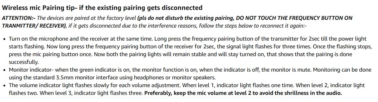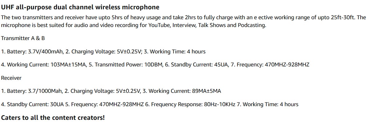 • Transmission Rate for UHF mic and receivers: 500-690Mhz with 10dBm transmission power that ensures low level of latency and increases audio quality and clarity.