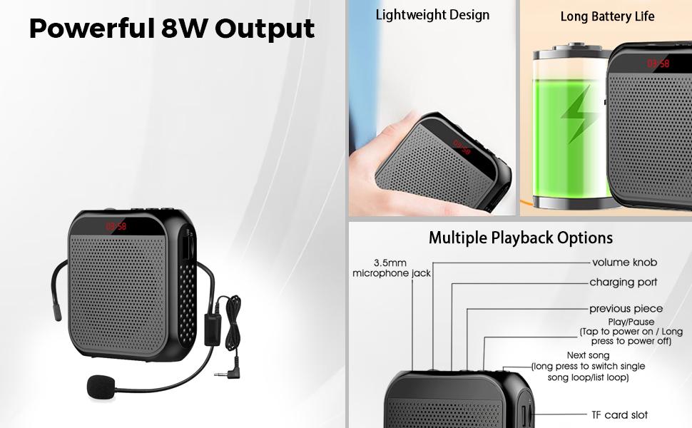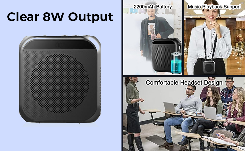 • POWERFUL SOUND: Compact size voice amplifier with 8W output is clear and noiseless, enough to cover a large room of 20-50 people. The microphone headset is lightweight and adjustable. You can adjust the distance between the microphone and mouth with its flexible gooseneck. Comfortable design for long sessions. Please keep the speaker and microphone at a distance to avoid facing each other so the signal won't get affected. Note: The voice amplifier haven't bluetooth function.