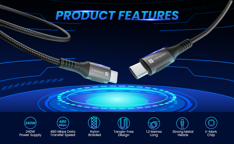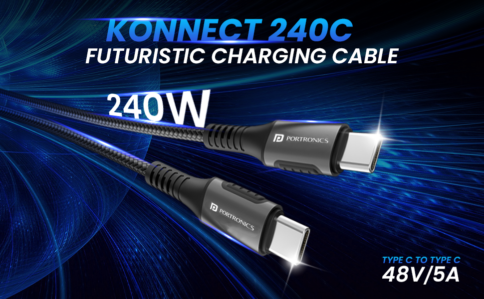 Portronics Konnect 240C 240W Futuristic Unbreakable Nylon Braided Type C Fast Charging Cable 1.2M Long, Supports Laptop and All C Smartphones and Devices (Black)
