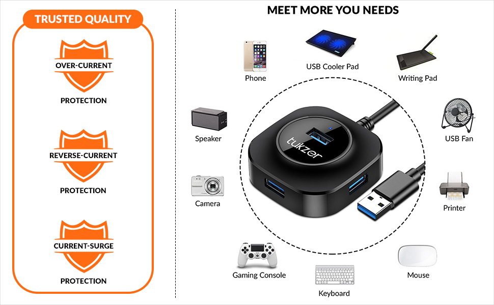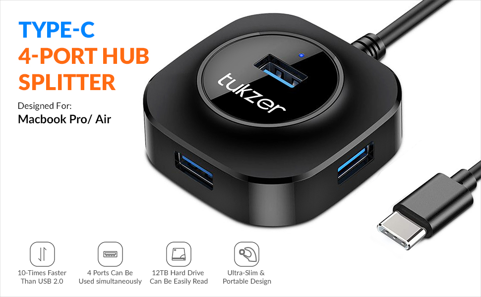 • Tukzer Tz-U13 4-Port USB C 3.0 Hub: Connects up to 4 USB devices to your Laptop such as external hard drives, USB flash drives, mouse, keyboard, USB headphone, speakers, memory cards, keyboard, mouse and much more USB devices, etc. It keeps you away from the trouble of plugging& unplugging repeatedly.