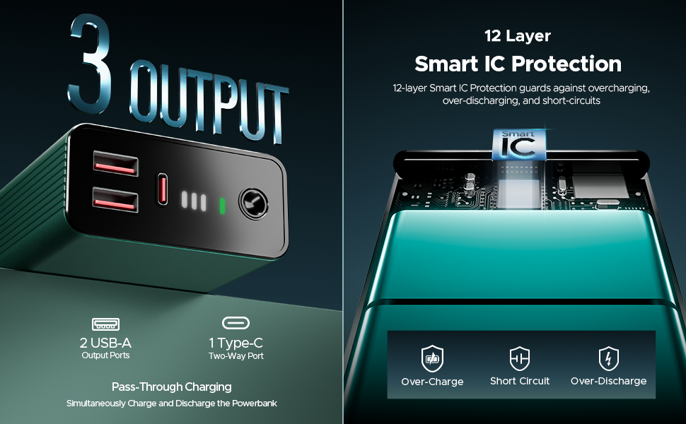 - 1x Input Port & 3x Output Ports: Charge your devices with the Type-C 2-way port that supports both input and output and two USB-A output ports for non-stop performance.