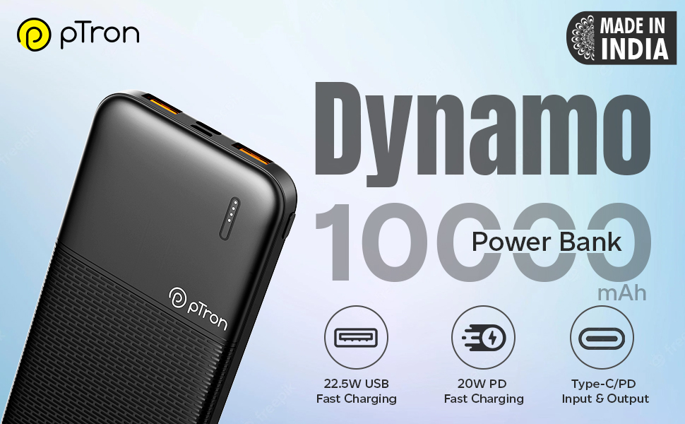- Dynamo power bank has a high-density 10000mAh Li-polymer battery & a fast charging output of 22.5W (4.5V/5A USB). It is a made-in-India power bank. A short 3A charging Type-C USB cable is included.